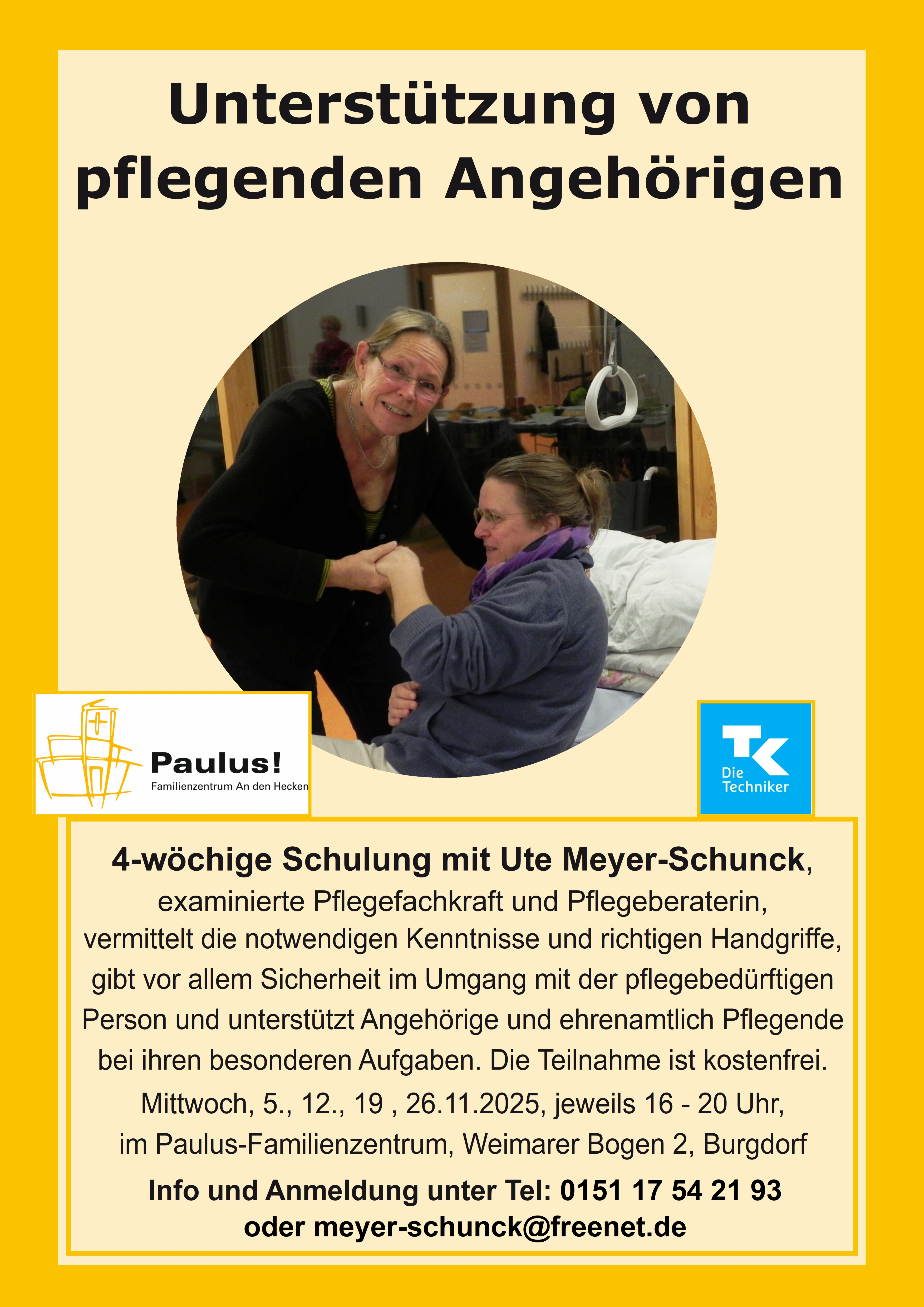 In der 4-wöchigen Schulung vermittelt Ute Meyer-Schunck, examinierte Pflegefachkraft und Pflegeberaterin, die notwendigen Kenntnisse und richtigen Handgriffe. Sie gibt vor allem Sicherheit im Umgang mit der pflegebedürftigen Person und unterstützt Angehörige und ehrenamtlich Pflegende bei ihren besonderen Aufgaben. Die Teilnahme ist kostenfrei.