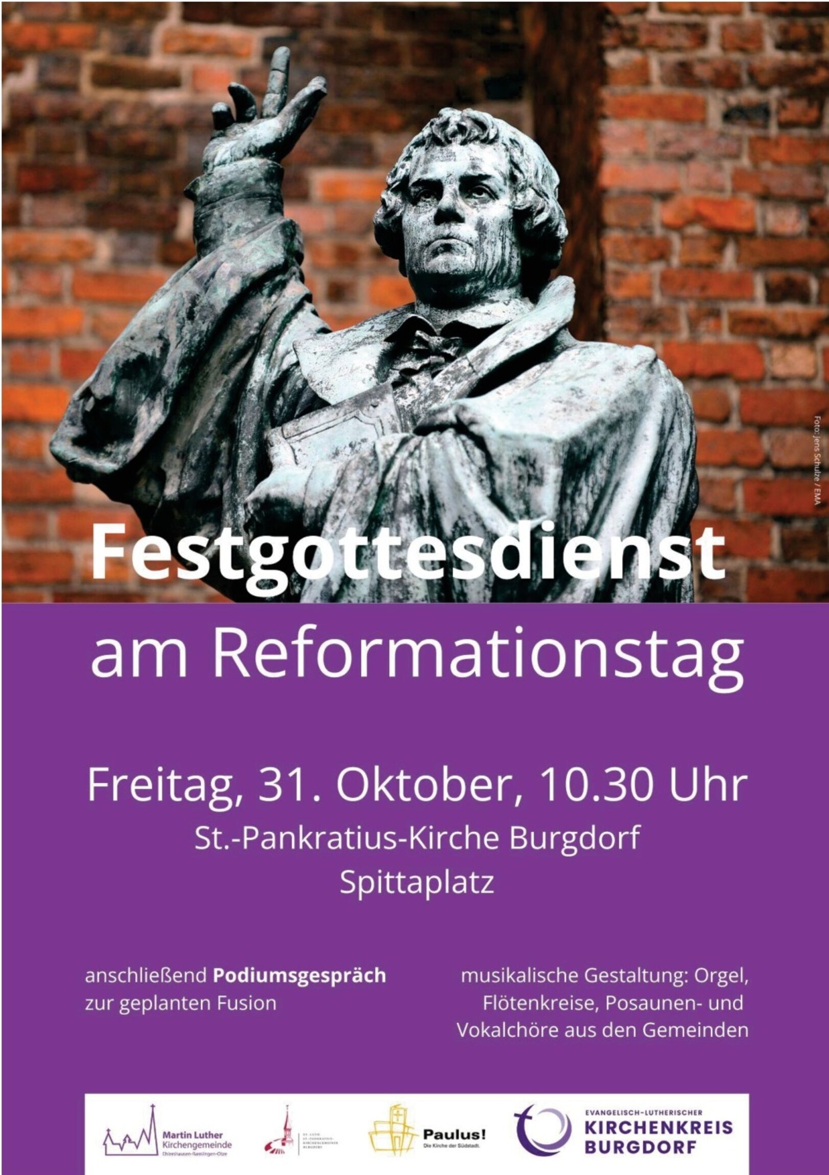 Die Entscheidung für die Fusion der drei Burgdorfer Kirchengemeinden soll in einem Festgottesdienst am morgigen Reformationstag um 10.30 Uhr in der St. Pankratiuskirche gefeiert werden. Herausragend beteiligt sind insbesondere die musikalischen Gruppen der drei Kirchengemeinden. Der Anstoß des Reformationstages ist: die Kirche muss sich immer wieder neu erfinden. Diese Aufgabe nimmt in Burgdorf nun konkret Gestalt an.