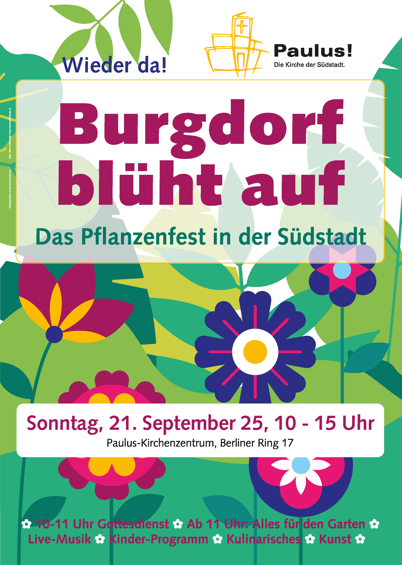 Das Paulus-Pflanzenfest ist zurück: Alles rund um Garten- und Zimmerpflanzen, Live-Musik, kulinarische Köstlichkeiten, Spiel und Spaß für Groß und Klein werden am Sonntag, 21. September, in der Zeit von 11 bis 15 Uhr rund um die Pauluskirche am Berliner Ring unter dem Motto „Burgdorf blüht auf“ präsentiert. Mit mehr als 20 Ständen ist das fest so groß wie noch nie.