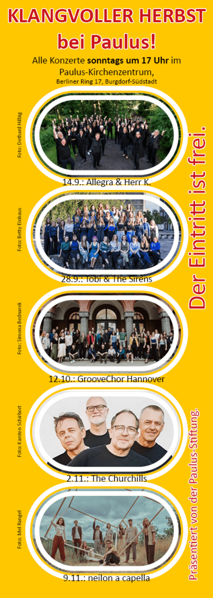 Das wird ein klangvoller Herbst im Paulus-Kirchenzentrum in der Südstadt. Gleich fünf außergewöhnliche musikalische Leckerbissen präsentiert die Paulus-Stiftung. „Die Qualität unserer Konzertreihe hat sich herumgesprochen“, sagen die Organisatoren Thomas Matthes und Stefan Zorn aus dem Stiftungsvorstand. „wir konnten drei Top Acts aus Hannover nach Burgdorf locken und haben mir dem Chor Allegra & Herr K sowie der Band The Churchills hervorragende Lokalmatadore am Start.“ Alle Konzerte finden jeweils an einem Sonntagnachmittag ab 17 Uhr im Paulus-Kirchenzentrum, Berliner Ring 17, statt.