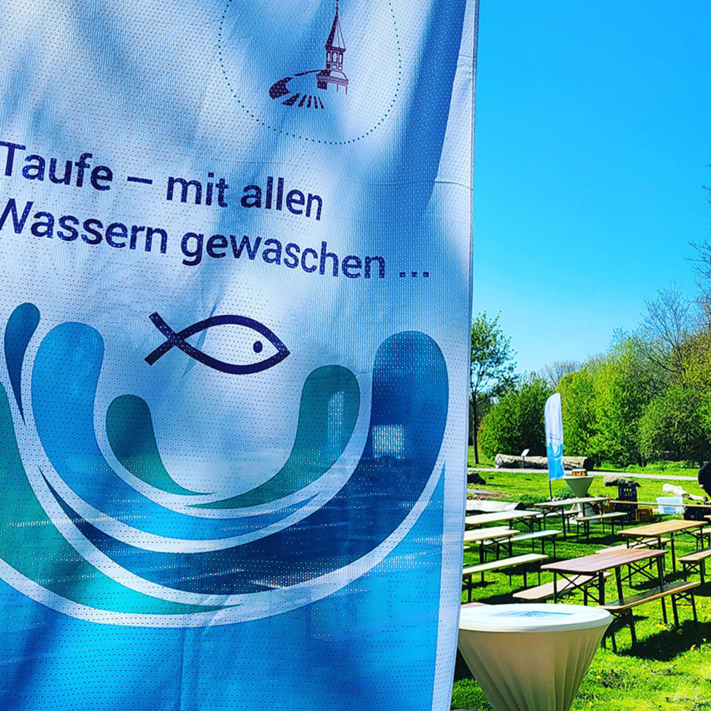 Auf dem Gelände der Burgdorfer Pfadfinder*innen warten verschiedene Stationen auf die Besucher*innen. Pastor*innen aus den Kirchengemeinden stehen bereit, um Kinder, Jugendliche und Erwachsene zu taufen oder mit ihnen eine Tauferinnerung zu feiern.